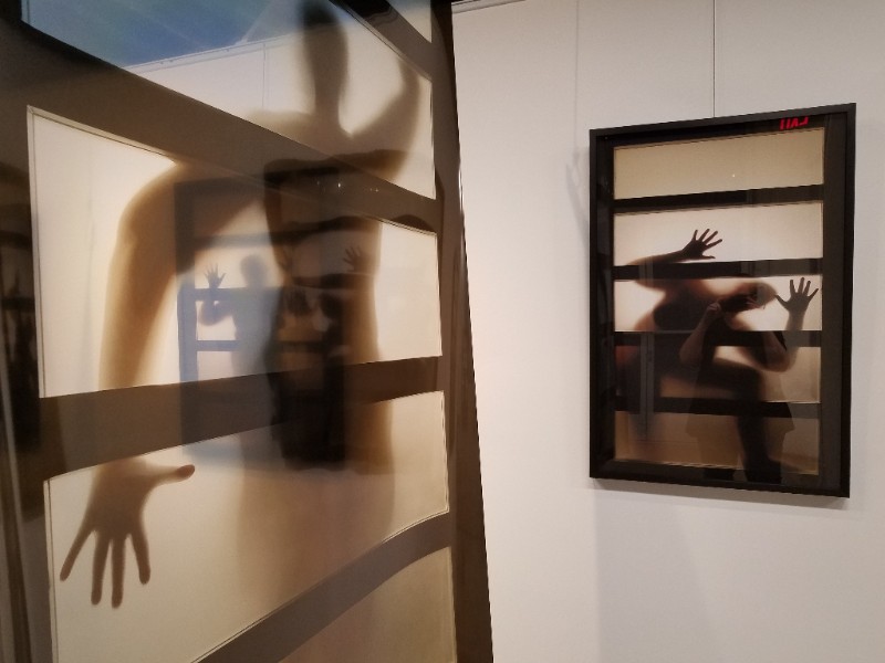 In each of the images, Schomaker captures her naked body pressed against the translucent surface in different poses—some suggesting dance, others suggesting imprisonment. Schomaker is unabashed at presenting the folds of her skin. While she has spoken about her conflicted relationship to her body, in these works she celebrates the silhouettes created in a private performance that captured the curves and shapes of her body, hazily seen behind the glass. She states, “This new body of work is about: confrontation, weight, shape, excess, history, voyeurism, objectification, control, confinement, containment, self-esteem, confidence, bravery, revealing and concealing, authenticity.”